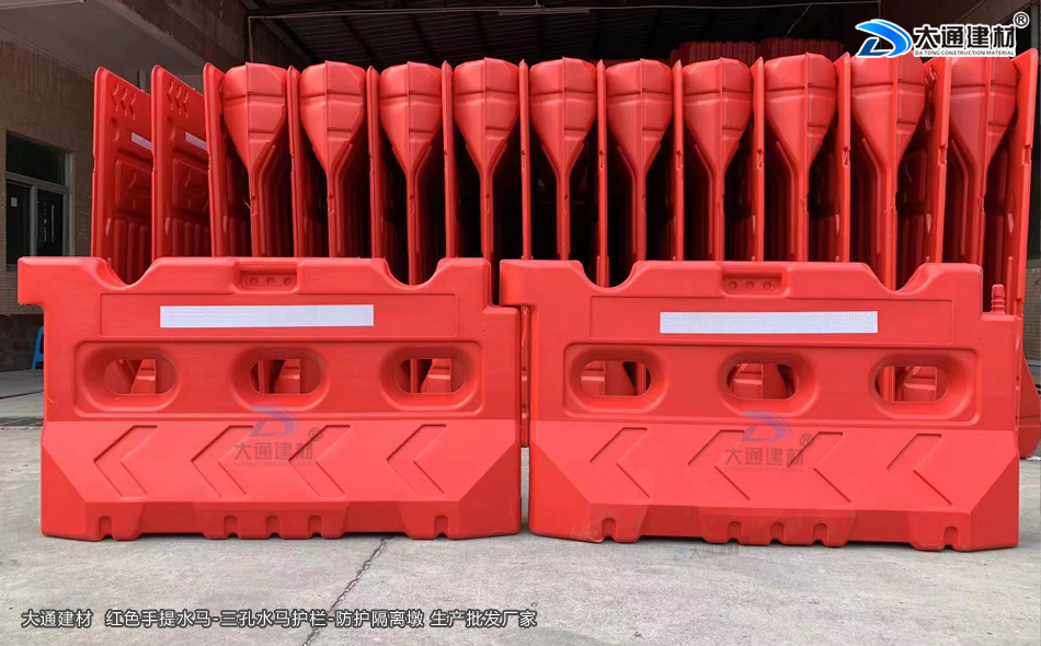 大通建材手提水馬又稱注水水馬、施工水馬、塑料水馬圍欄、塑料圍欄、塑料隔離欄、隔離水馬、交通水馬等,用于城市道路、公路、高速隔離、工地建設、施工地、收費站、路口、廣場、商場引導隔離等地方 臨時分道路使用。